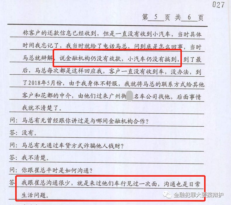 对证言内容真实性、合法性无异议。从周某某的笔录,可知4月底被御某车行马某某以“检测”为名骗走,并且甲方的盖章是广州市偶某汽车贸易公司,转账也是转给马某某与其弟弟马某某2(通过民生银行转账126800元,招商银行转账160000元,偶某车行刷卡25000元,微信支付给马某某30000元)(补充卷1p128 -195),通过微信支付给崔某某的5000元,崔某某在补充侦查卷2p10也供述,当天即时通过微信转回给马某某,而对于后期办理贷款的事宜(补充卷1p14)崔某某一概不知,都是由马某某办理的。