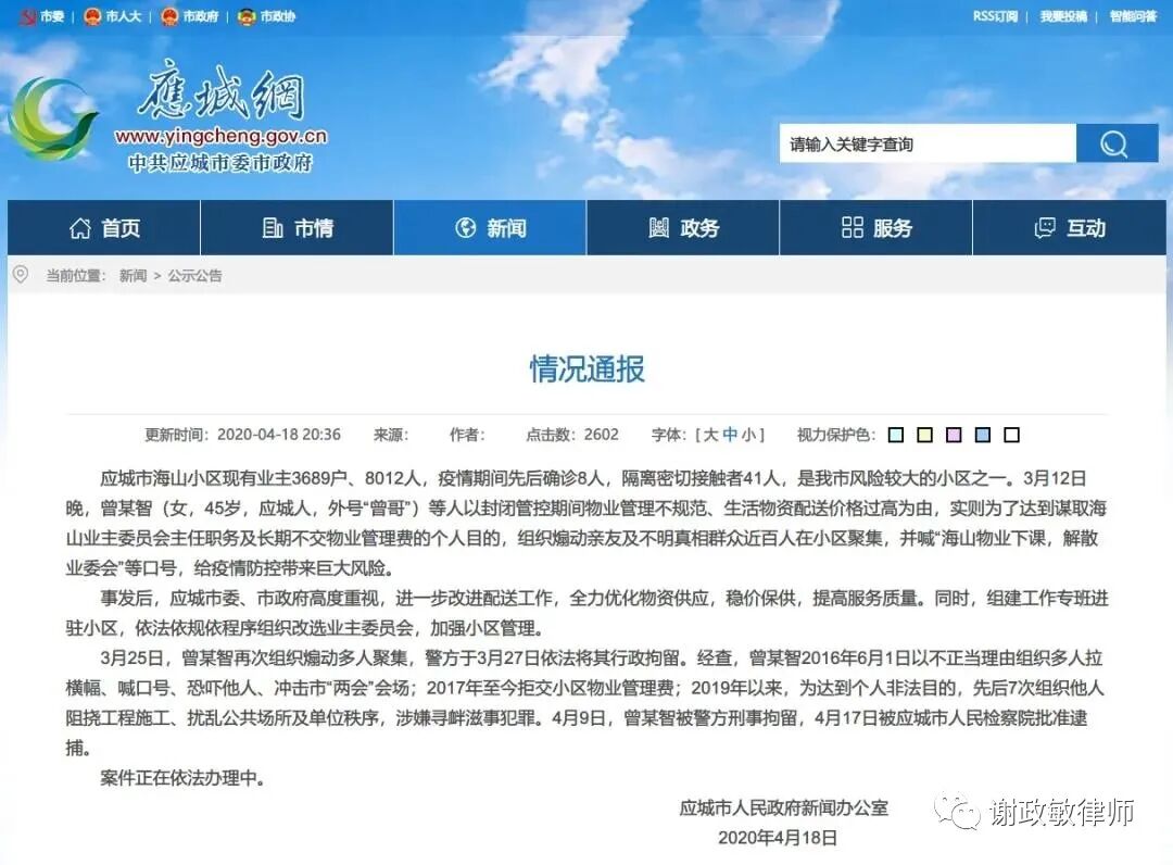 4月18日晚,湖北省应城市委官方网站通报称:“(2020年)3月12日晚,曾某智等人以封闭管控期间物业管理不规范,生活物资配送价格过高为由,实则为了达到谋取海山业主委员会主任职务及长期不交物业管理费的个人目的,组织煽动亲友及不明真相群众近百人在小区聚集,并喊‘海山物业下课,解散业委会’等 口号,给疫情防控带来巨大风险。